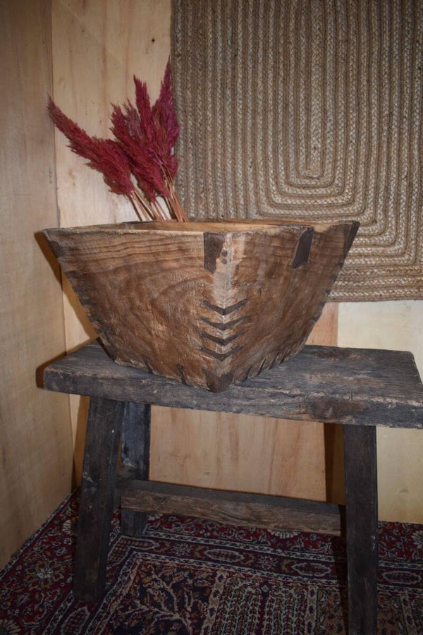 Een rijstbak uit India is een traditioneel, handgemaakt object dat meestal werd gebruikt voor het bewaren en vervoeren van rijst of andere granen. Deze bakken zijn van hout, maar kunnen ook van metaal of klei zijn gemaakt, afhankelijk van de regio en het specifieke gebruik. Ze variëren in grootte, maar ze zijn meestal vrij groot en hebben een praktische, eenvoudige vorm.